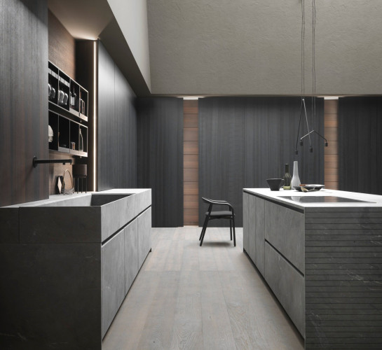 The combination of Piasentina stone and black metal stoneware brings out the shapes and volumes of the entire island where the two large functional islands stand out.